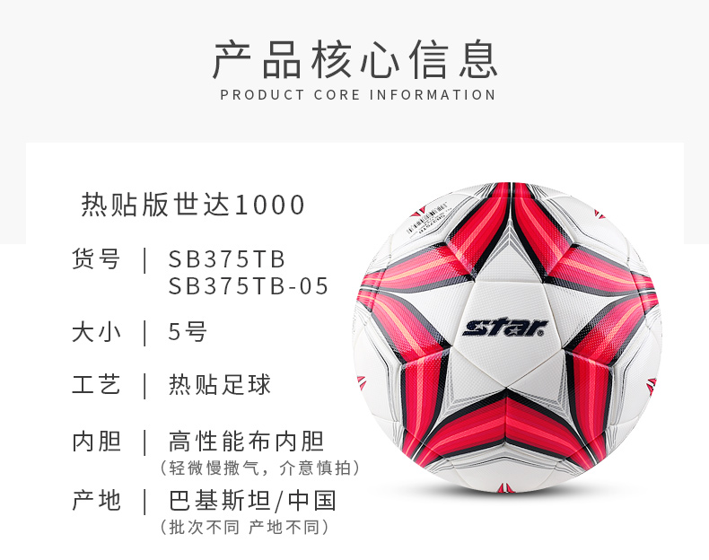 STAR世达足球1000高性能布内胆特殊涂层PU热贴合防水训练比赛用球SB375TB标准5号成人学4号