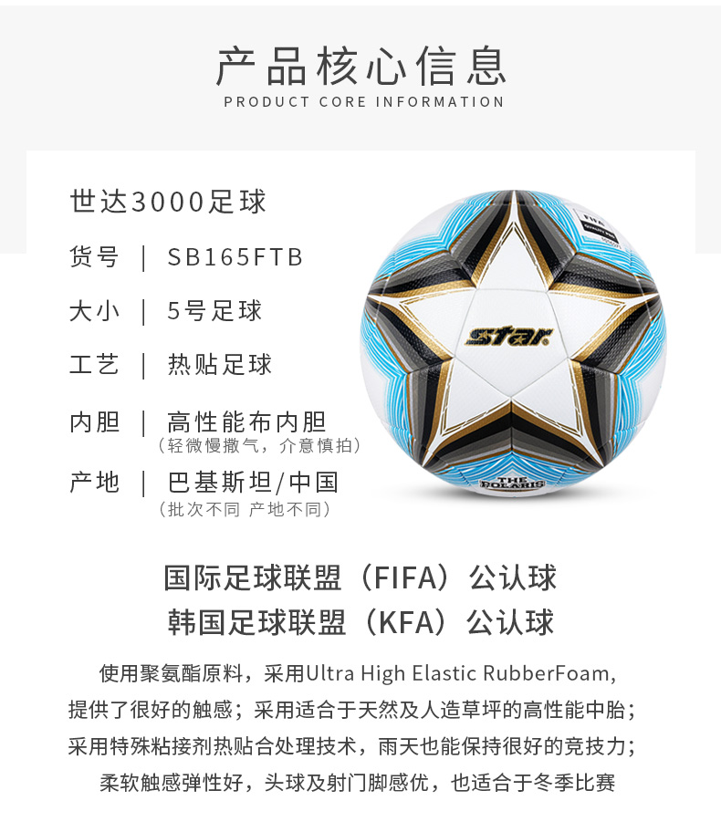 STAR世达足球3000世达SB165FTB聚氨酯高性能中胎热贴合专业比赛专用球5号